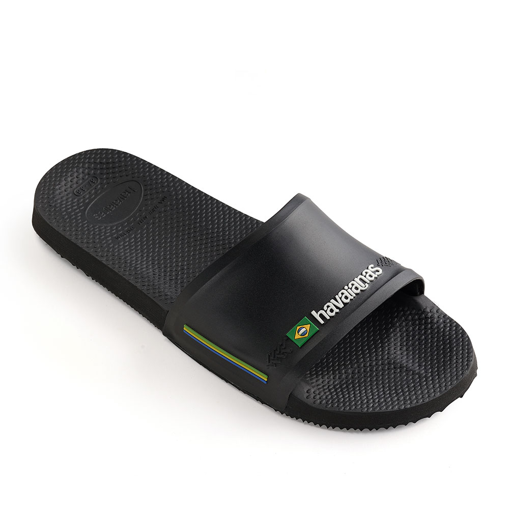 Ανδρικές σαγιονάρες της εταιρείας HAVAIANAS κατασκευασμένες εξ’ολοκλήρου από επεξεργασμένο καουτσούκ. Η εξωτερική σόλα τους διαθέτει αυλακώσεις για αποτελεσματική πρόσφυση και ανάγλυφο λογότυπο της εταιρείας. Σας προτείνουμε να επιλέξετε ένα νούμερο μικρότερο από το real size του ποδιού καθώς έχουν μεγάλη φόρμα.