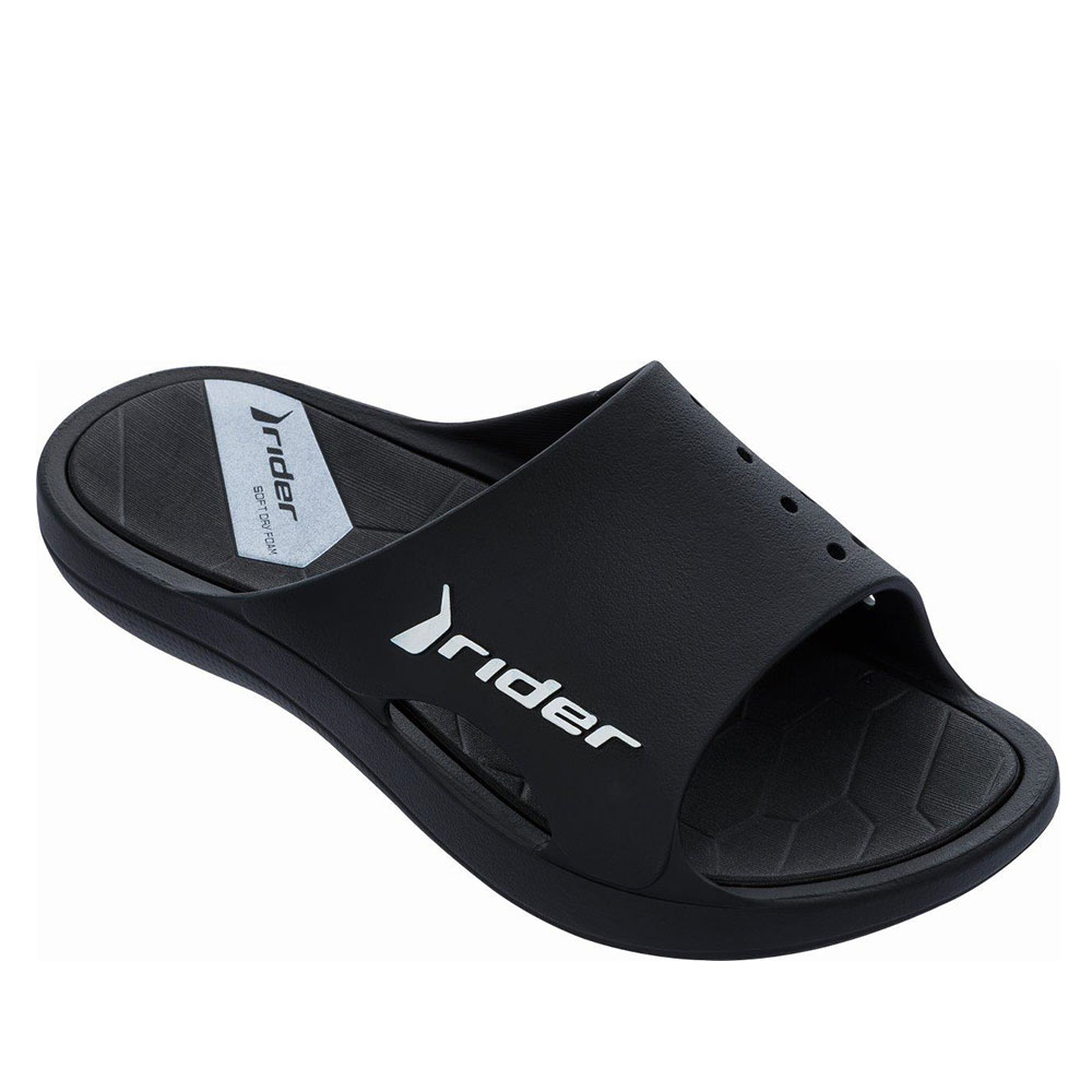 Ανδρικές σαγιονάρες της εταιρείας RIDER κατασκευασμένες από μαλακό λάστιχο καουτσούκ 100% ανακυκλώσιμο. Διαθέτουν ανατομικό πέλμα όπου στεγνώνει έυκολα χάρη στην τεχνολογία DRY ECO FOAM. Ξεκούραστες και ανθεκτικές με αντιολισθητική και ευλύγιστη σόλα.