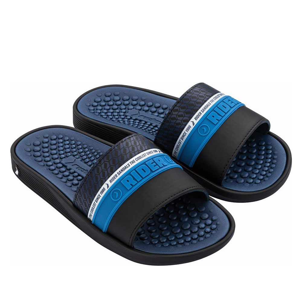 Ανδρικές σαγιονάρες της εταιρείας RIDER κατασκευασμένες από λάστιχο καουτσούκ, μαλακό εύκαμπτο και αντιολισθητικό υλικό για άνεση και προστασία του πέλματος. Είναι ευκολοσυνδύαστες και ιδανικές για την παραλία. Σας προτείνουμε να επιλέξετε ένα νούμερο μεγαλύτερο από αυτό που συνήθως φοράτε καθώς έχουν μικρή εφαρμογή.