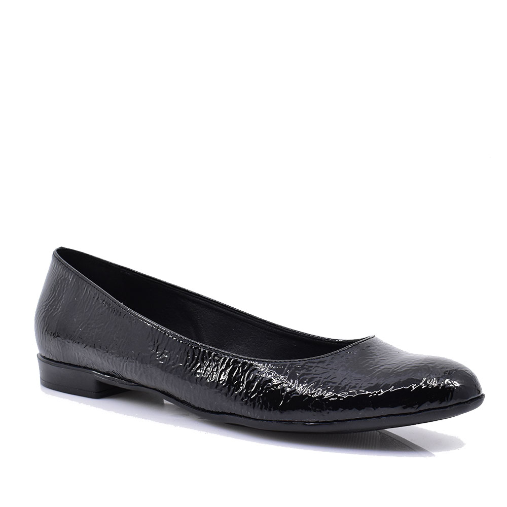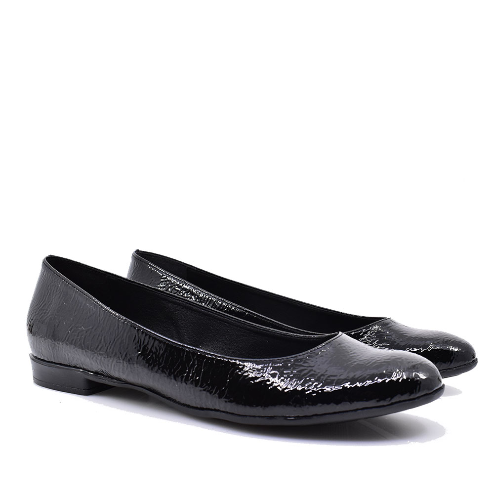 Γυναικείες μπαλαρίνες ελληνικής προέλευσης σε λουστρίν επιφάνεια με μαλακό πατάκι, άνετες για καθημερινή χρήση.