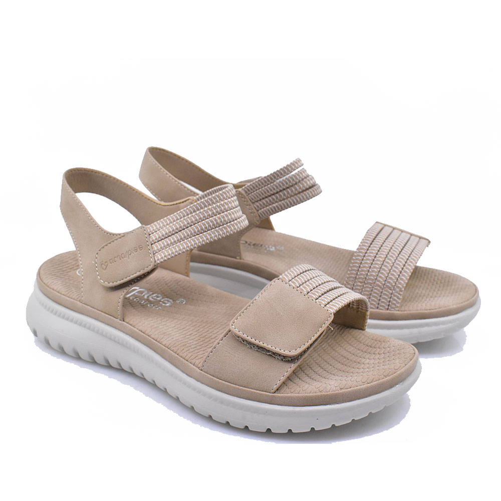 Γυναικεία πέδιλα κατασκευασμένα από συνθετικό υλικό με μαλακό πάτο για άνετο βάδισμα. Διαθέτουν αντιολισθητική σόλα για ασφάλεια και αποφυγή κραδασμών, με αυτοκόλλητη ταινία velcro στο επάνω μέρος. Ελαφρύ υπόδημα ιδανικό για καθημερινή χρήση.