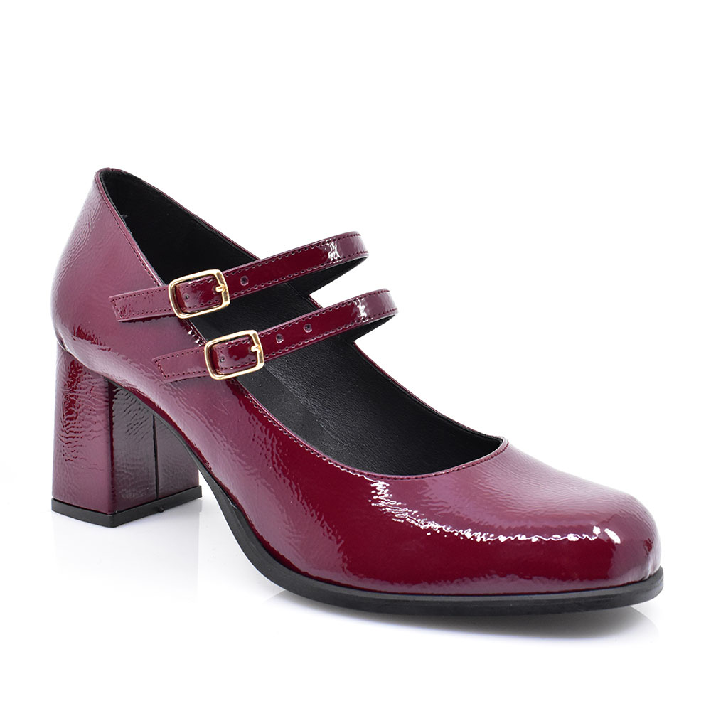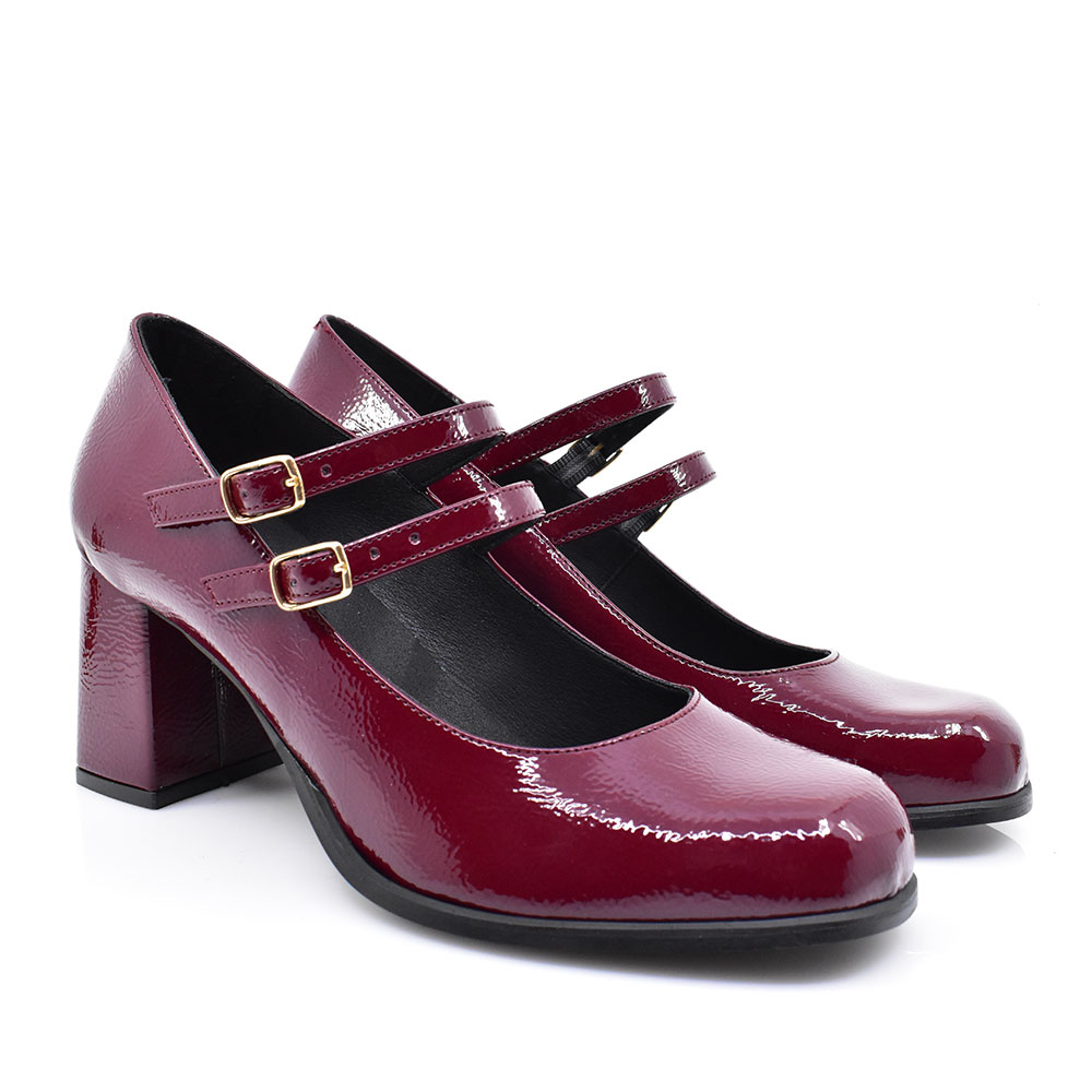 Γυναικείες γόβες της εταιρείας STEFANIA ελληνικής προέλευσης, με χαμηλό τετράγωνο τακούνι, μπαρέτα και στρογγυλό τοκά στο ύψος του κουτεπιέ. Σε λούστρινη επιφάνεια ιδανικές για καθημερινή χρήση.