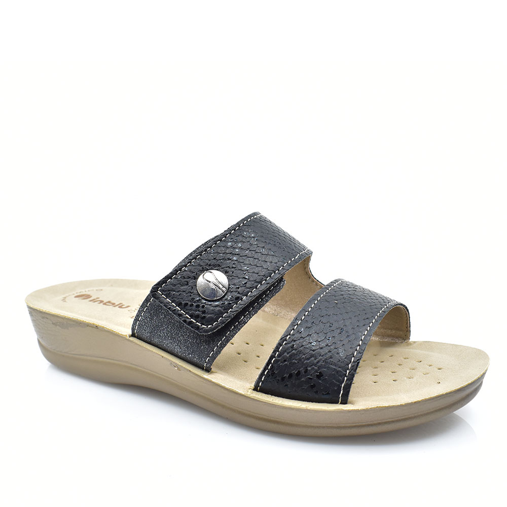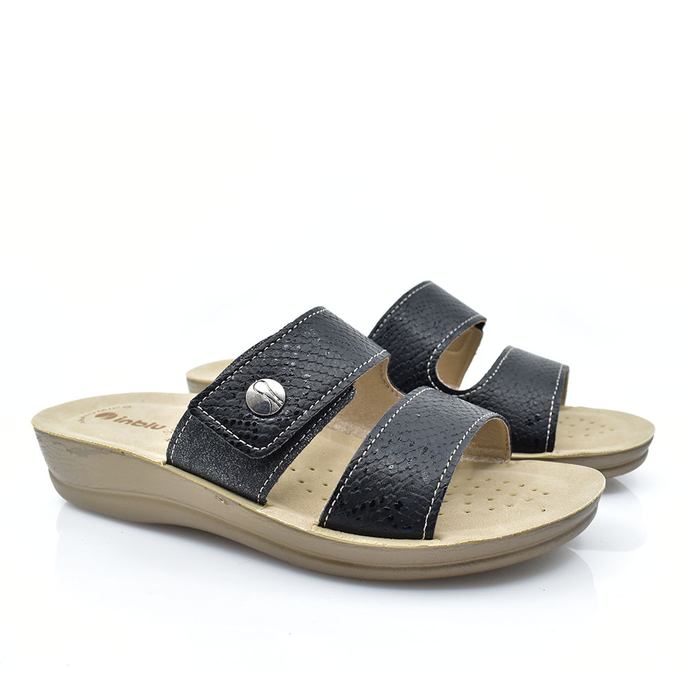 υναικείες καλοκαιρινές παντόφλες της εταιρείας INBLU κατασκευασμένες από συνθετικό υλικό με ανατομικό δερμάτινο πάτο για άνετο περπάτημα. Διαθέτουν αντιολισθητική σόλα για ασφάλεια όλες τις ώρες της ημέρας και αυτοκόλλητα στο επάνω μέρος για σταθερά βήματα.