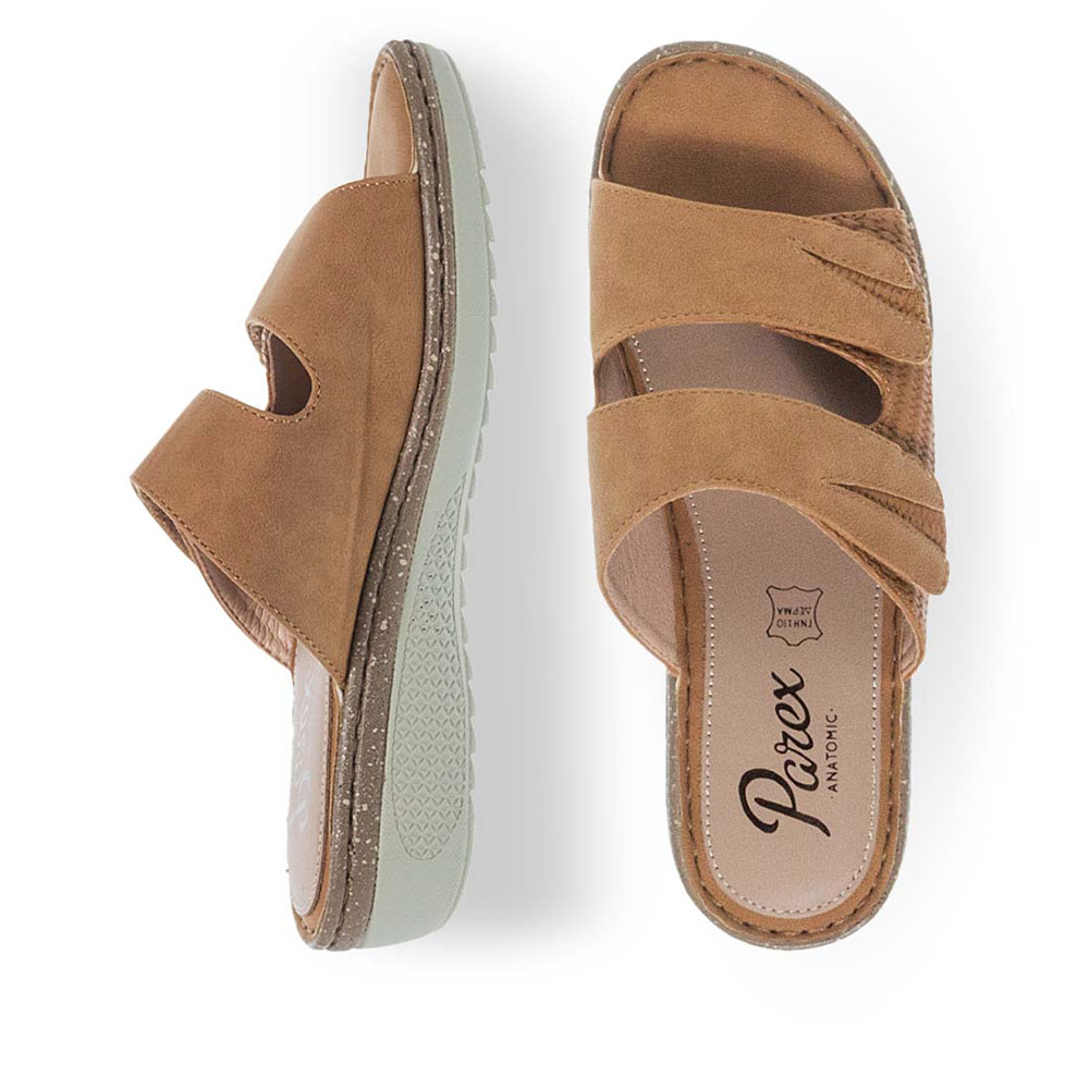 Γυναικείες παντόφλες της εταιρείας PAREX με ανατομικό δερμάτινο πάτο για άνετο βηματισμό και αντιολισθητική σόλα για μεγαλύτερη ασφάλεια στα βήματα σας. Διαθέτουν αυτοκόλλητη ταινία velcro στο επάνω μέρος για να προσαρμόζεται στις ανάγκες του ποδιού.