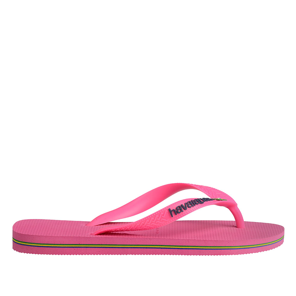Γυναικείες σαγιονάρες της εταιρείας HAVAIANAS κατασκευασμένες εξ’ολοκλήρου από επεξεργασμένο καουτσούκ. Η εξωτερική σόλα τους διαθέτει αυλακώσεις για αποτελεσματική πρόσφυση και ανάγλυφο λογότυπο της εταιρείας. Σας προτείνουμε να επιλέξετε ένα νούμερο μεγαλύτερο από το real size του ποδιού καθώς έχουν μικρή φόρμα.