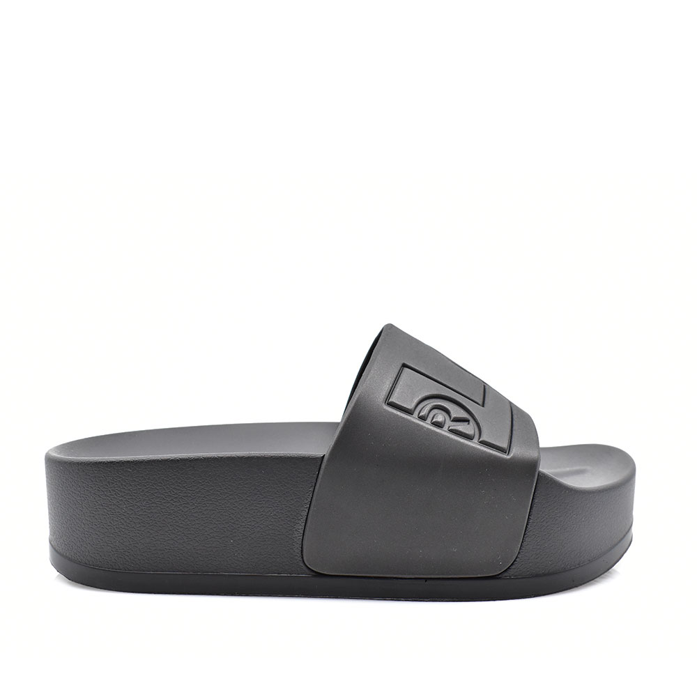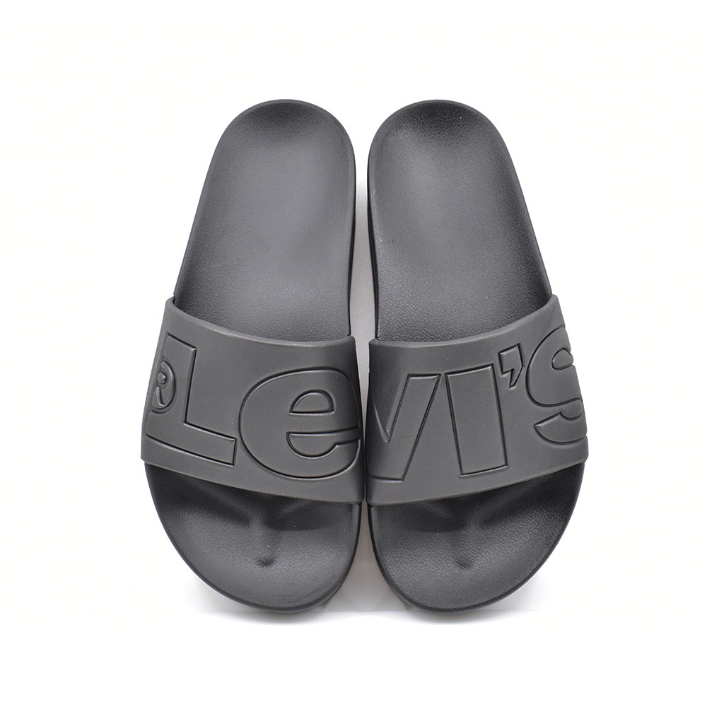Γυναικείες σαγιονάρες της εταιρείας LEVIS κατασκευασμένες εξ’ολοκλήρου από επεξεργασμένο συνθετικό υλικό με αντιολισθητική σόλα και ανάγλυφο λογότυπο της εταιρείας.