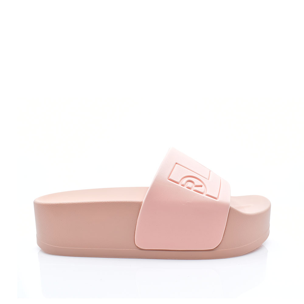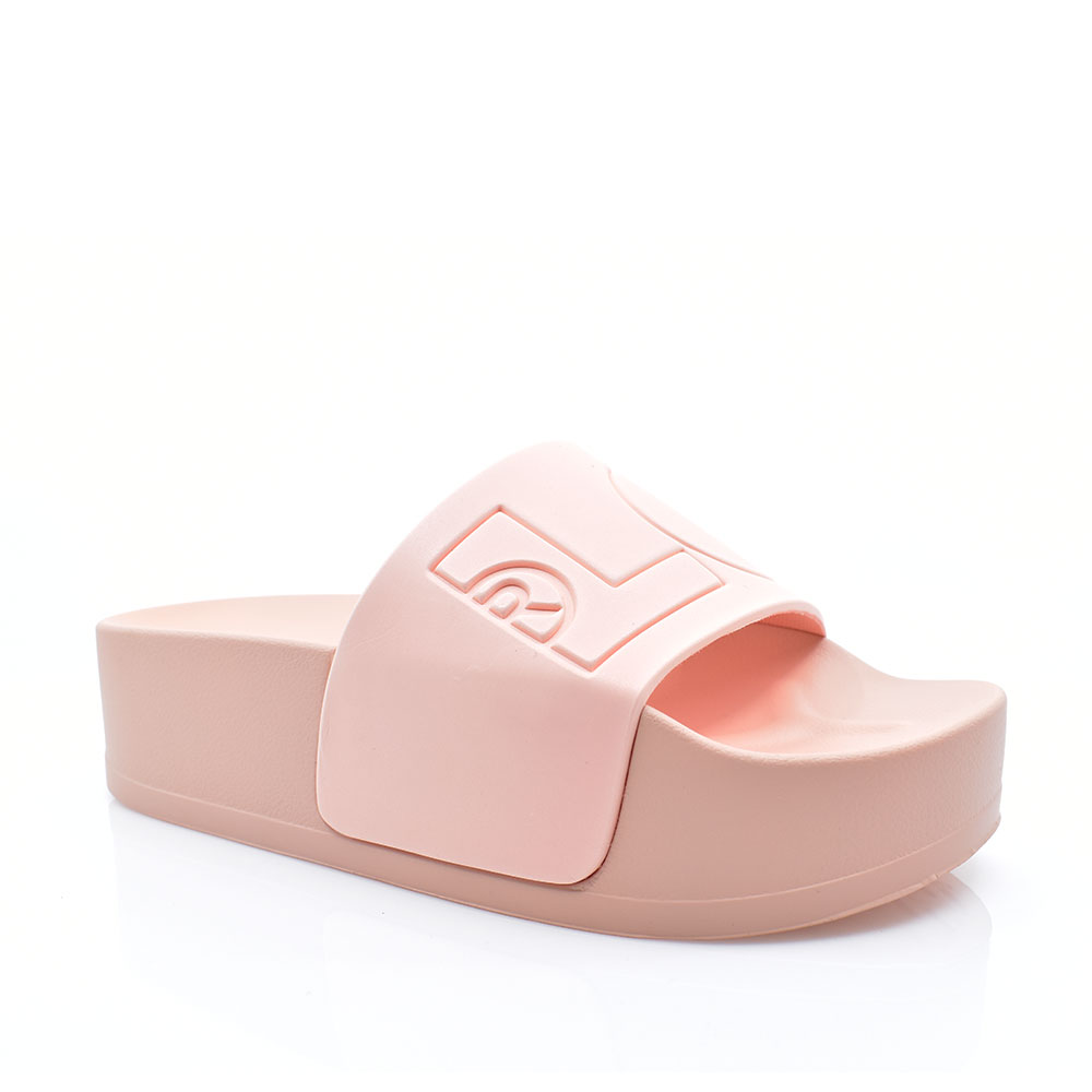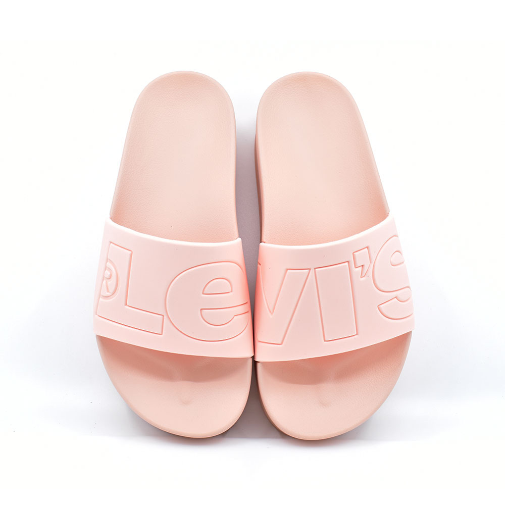 Γυναικείες σαγιονάρες της εταιρείας LEVIS κατασκευασμένες εξ’ολοκλήρου από επεξεργασμένο συνθετικό υλικό με αντιολισθητική σόλα και ανάγλυφο λογότυπο της εταιρείας.