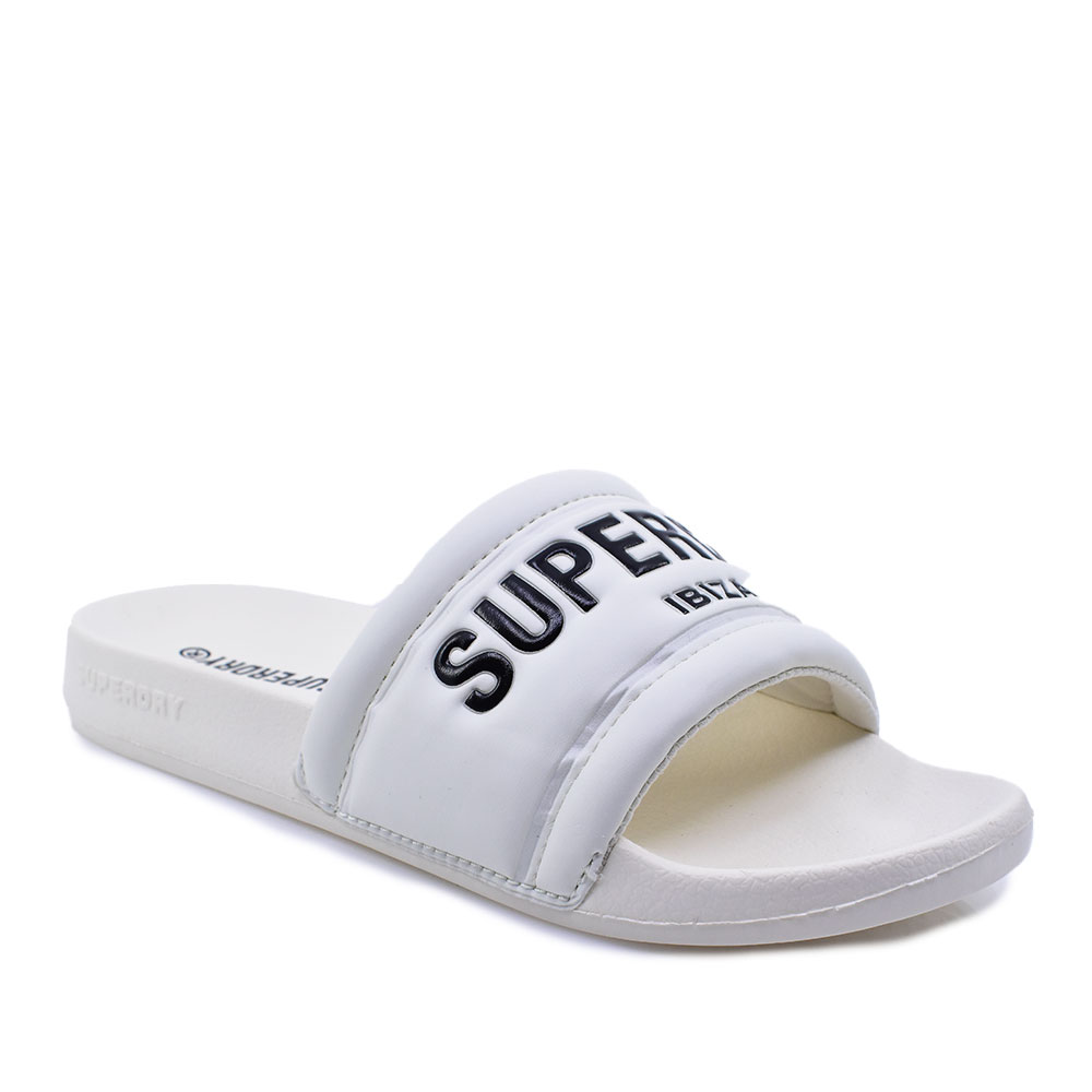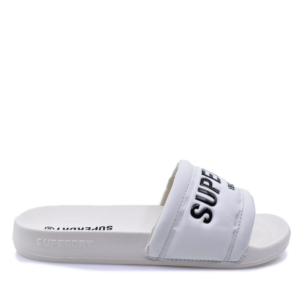 Γυναικείες σαγιονάρες της εταιρείας SUPERDRY με φάσα και αντιολισθητική σόλα, με σχέδιο το λογότυπο της εταιρείας.