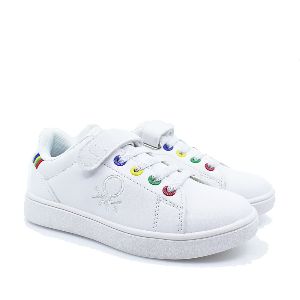 Παιδικά sneakers της εταιρείας BENETTON κατασκευασμένα από συνθετικό υλικό υψηλής ποιότητας και υφασμάτινη επένδυση. Εξοπλισμένα με αντιολισθητική σόλα για περισσότερη ασφάλεια, διαθέτουν αυτοκόλλητο και λαστιχένια κορδόνια για πιο εύκολη εφαρμογή και αφαίρεση.