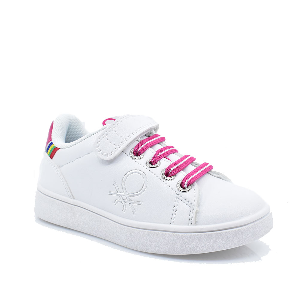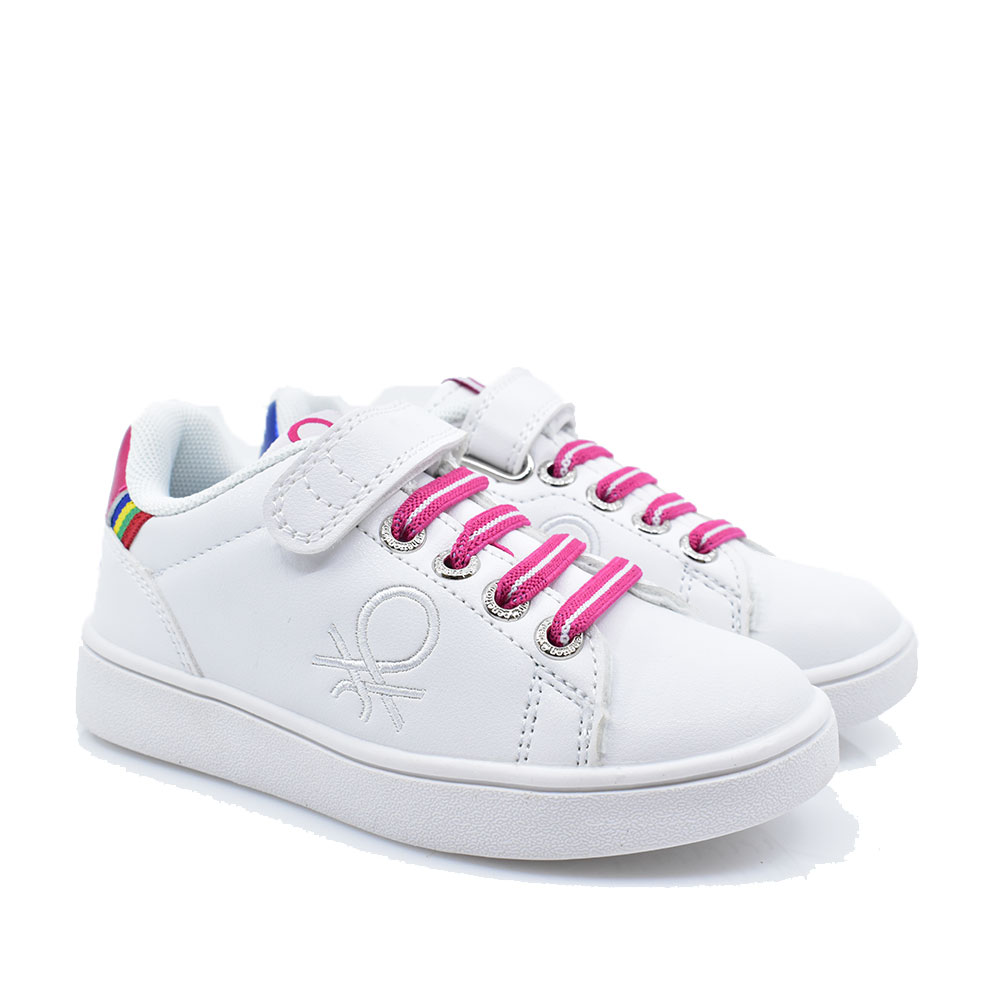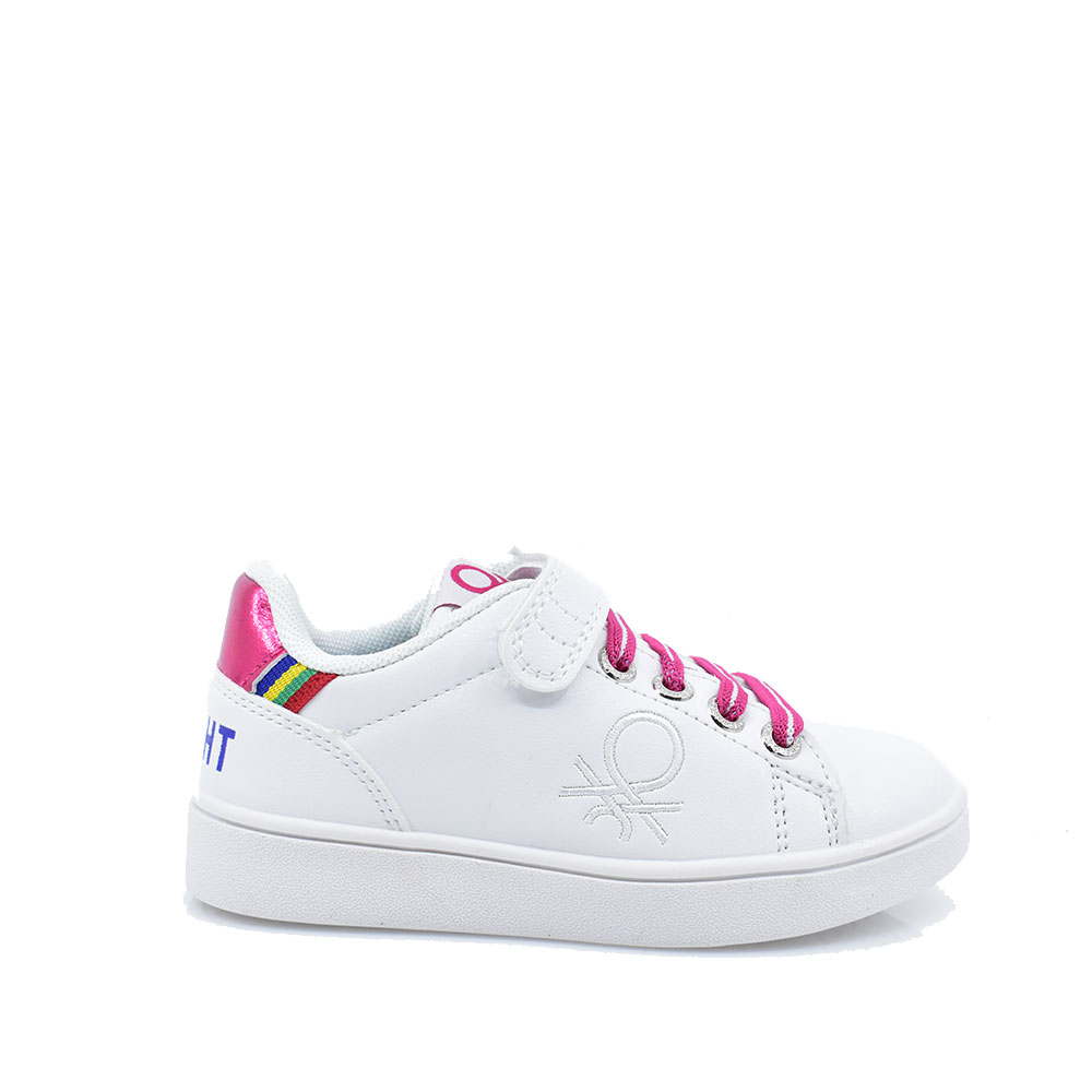 Παιδικά sneakers της εταιρείας BENETTON κατασκευασμένα από συνθετικό υλικό υψηλής ποιότητας και υφασμάτινη επένδυση. Εξοπλισμένα με αντιολισθητική σόλα για περισσότερη ασφάλεια, διαθέτουν αυτοκόλλητο και λαστιχένια κορδόνια για πιο εύκολη εφαρμογή και αφαίρεση.