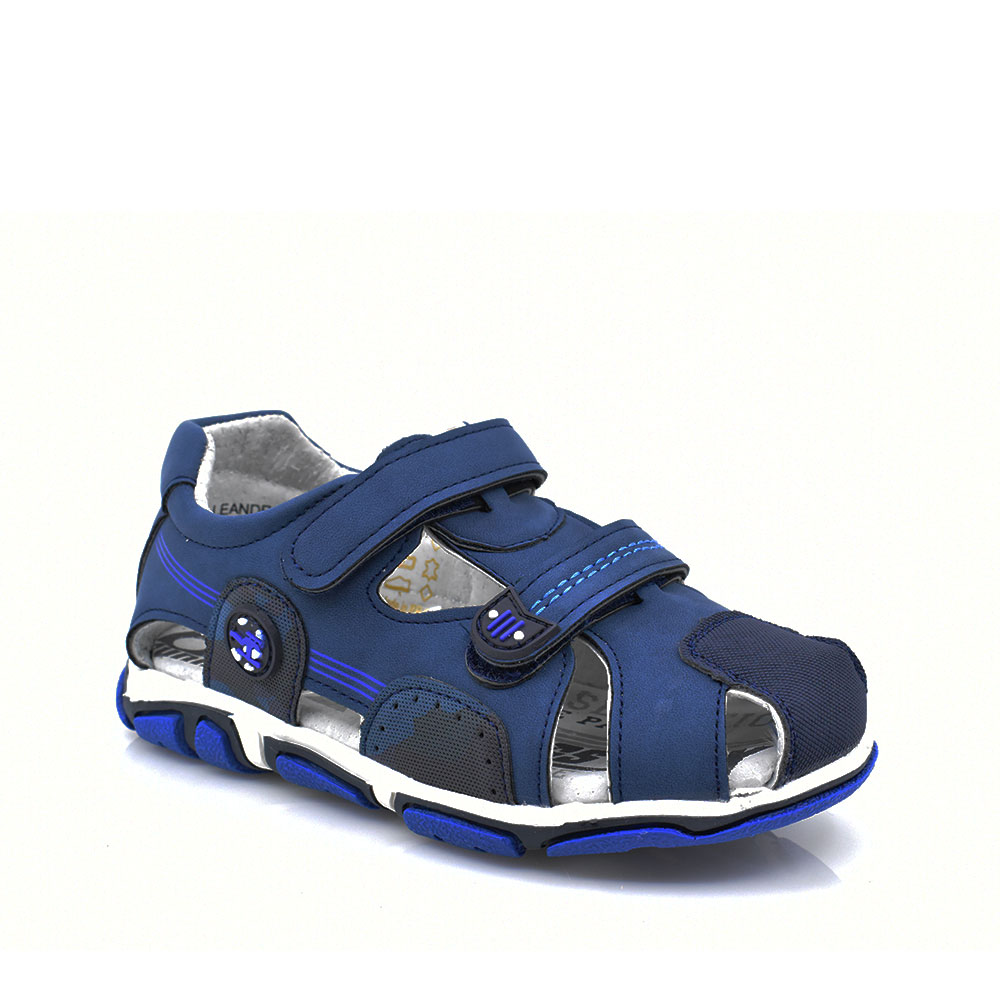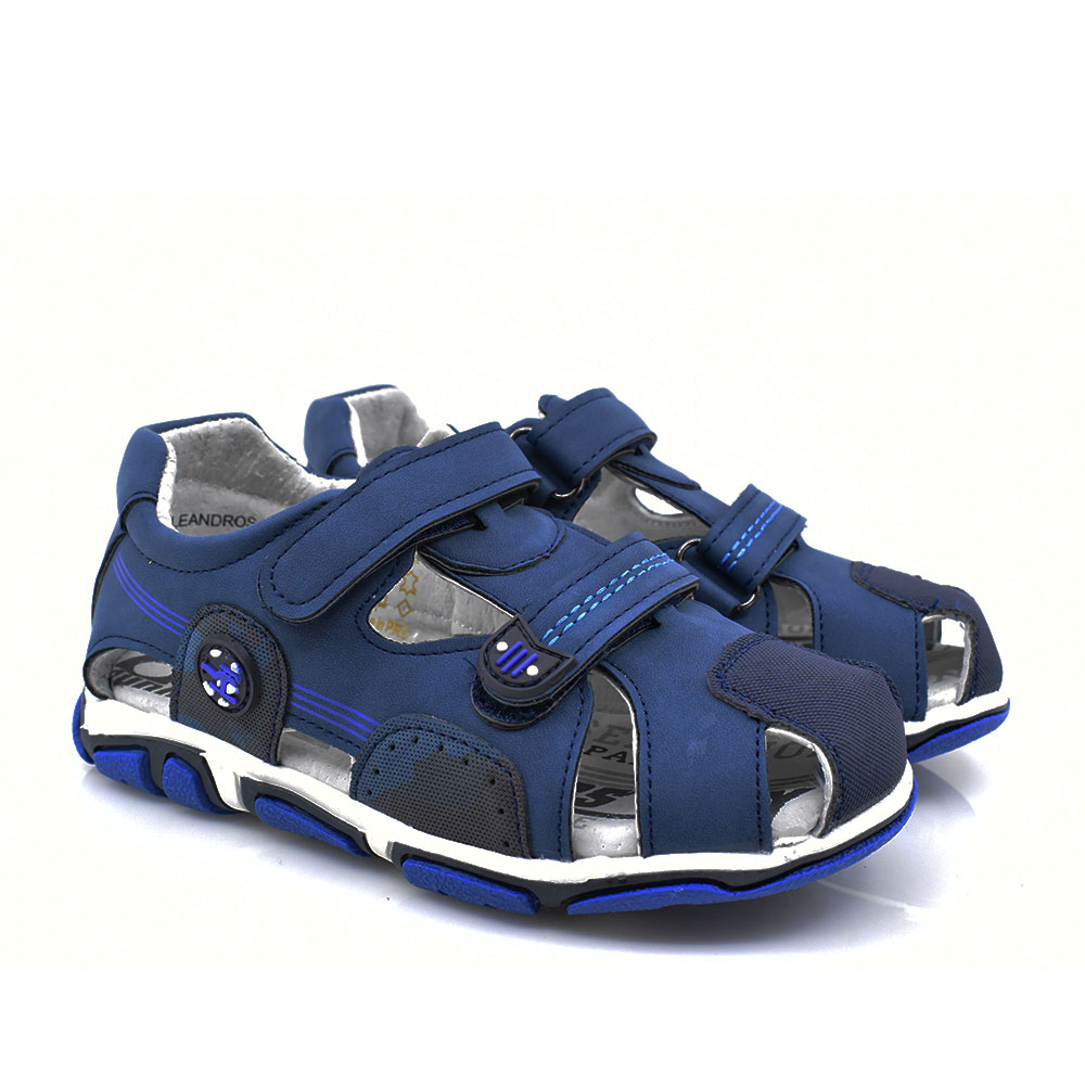 Παιδικά πέδιλα για αγόρια της εταιρείας IQ KIDS κατασκευασμένα από συνθετικό υλικό με δερμάτινο ανατομικό πάτο και αντιολισθητική σόλα για άνετα και σταθερά βήματα. Κλείνουν με αυτοκόλλητη ταινία velcro για εύκολη εφαρμογή και αφαίρεση.