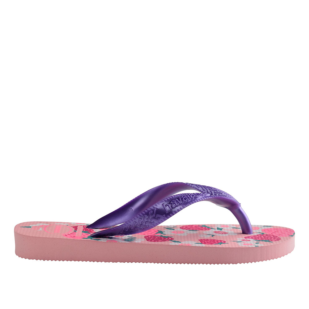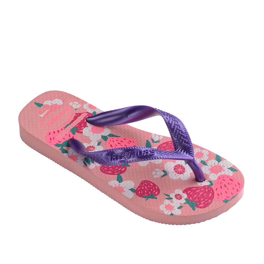 Παιδικές σαγιονάρες της εταιρείας HAVAIANAS κατασκευασμένες εξ’ολοκλήρου από επεξεργασμένο καουτσούκ. Η εξωτερική σόλα τους διαθέτει αυλακώσεις για αποτελεσματική πρόσφυση και ανάγλυφο λογότυπο της εταιρείας. Σας προτείνουμε να επιλέξετε ένα νούμερο μεγαλύτερο από το real size του ποδιού σας.